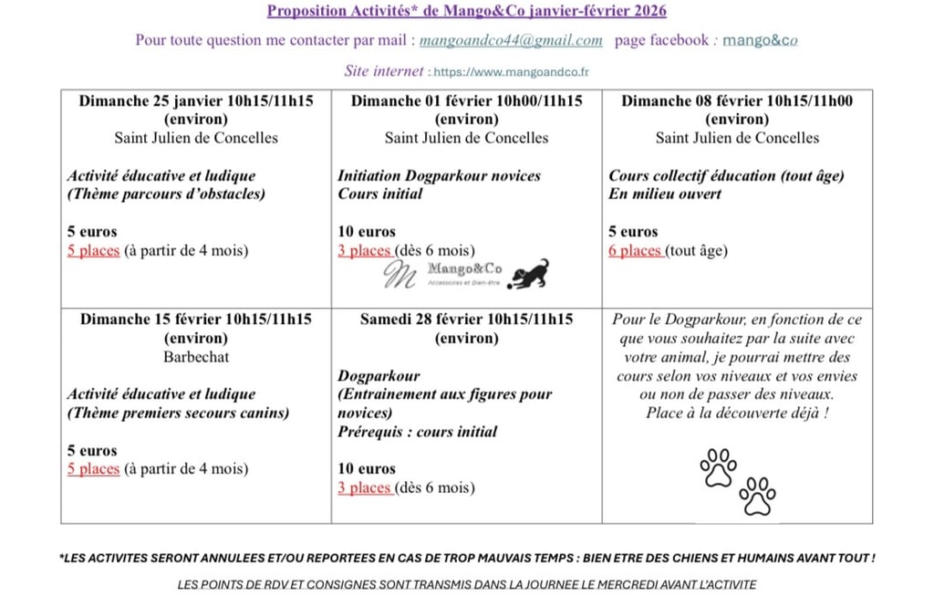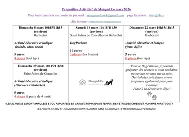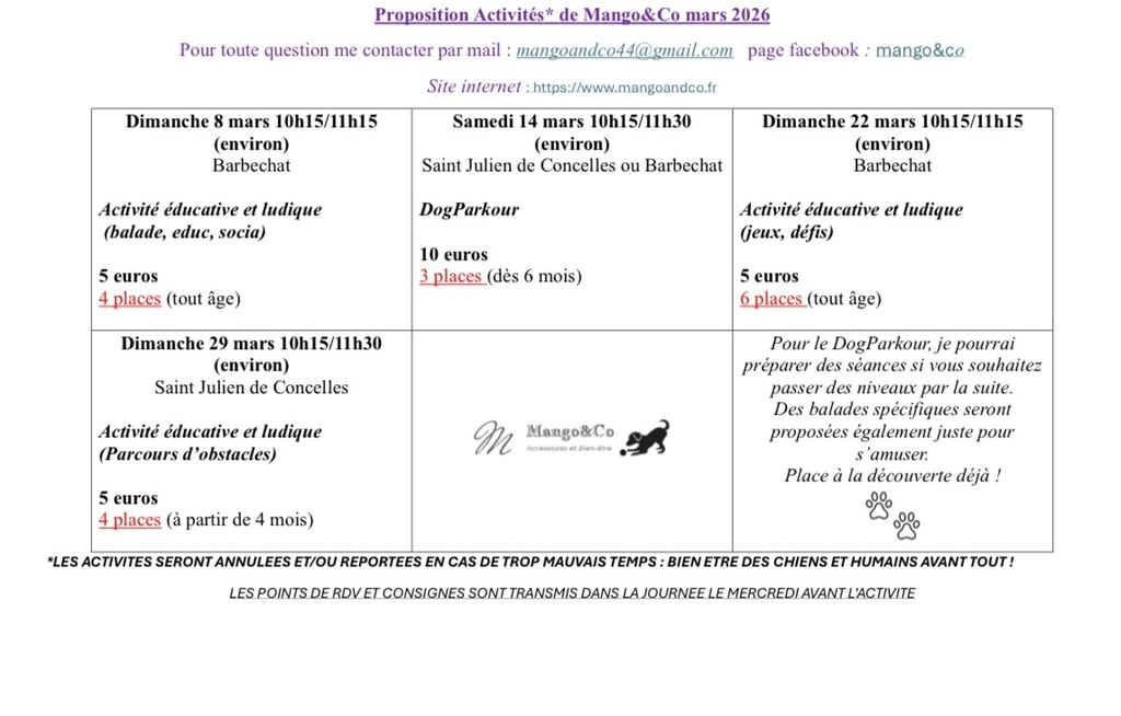 Chaque mois un planning d'activités est proposé (pour le week-end en général), il est posté en priorité sur le groupe WhatsApp privé de Mango&Co, que vous pourrez intégrer, puis sur le site internet et la page Facebook, les places sont limitées en fonction de l'activité, voir le planning ci-dessous tout y est inscrit!