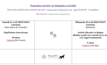 Chaque mois un planning d'activités est proposé (pour le week-end en général), il est posté en priorité sur le groupe WhatsApp privé de Mango&Co, que vous pourrez intégrer, puis sur le site internet et la page Facebook, les places sont limitées en fonction de l'activité, voir le planning ci-dessous tout y est inscrit!